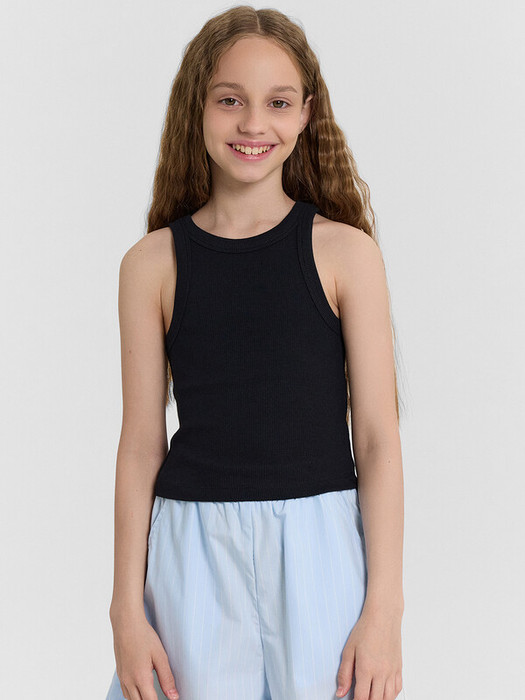 Топ для девочек из рибаны, облегающего силуэта, длиной ниже уровня талии. Перед и спинка цельнокроеные. Горловина круглая. Горловина и проймы окантованы широкой бейкой из основного полотна. Низ изделия обработан швом вподгибку.