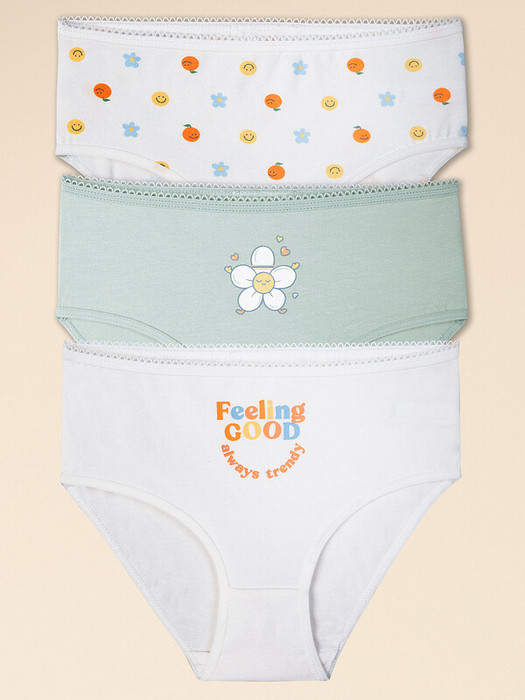 При выборе белья для своего ребёнка каждая мама хочет быть уверена в его качестве и в том, что ребёнку будет комфортно. Комплект трусов для девочки (3 шт.) полностью соответствует этим требованиям. Слипы высокой посадки выполнены из ткани с высоким содержанием хлопка — модель мягкая, прекрасно пропускает воздух, давая коже ребёнка дышать. Благодаря эластану в составе изделие надолго сохраняет отличную форму, даже после многочисленных стирок. Качественная ткань и анатомически правильный крой обеспечивают идеальную посадку на теле — ребёнку комфортно на протяжении всего дня. Мягкая резинка исключает раздражение и трение. Трусы детские для девочки представлены в трёх актуальных вариантах расцветки: белые со сплошным принтом в виде цветочков, смайликов и улыбающихся мандаринов, зелёные с принтом в виде улыбающейся ромашки и белые с позитивным принтом-надписью, надпись переводится: "хорошее настроение всегда в тренде". Принты эластичные и стойкие, отлично переносят частые стирки. В линейке представлены хлопковые трусы следующих размеров: 1 (86); 2 (92); 3 (98); 4 (104); 5 (110); 6 (116); 7 (122); 8 (128); 9 (134); 10 (140); 11 (146). Модель подходит девочкам дошкольного возраста, девочкам младшего школьного возраста и девочкам-подросткам. Трусы слипы для девочки — идеальный выбор детского белья для повседневной носки. Модные трусы станут хорошим подарком дочери или внучке на любой праздник. Выбирайте нужный размер по таблице размеров на фото. Цвет товара на экране вашего устройства может отличаться от цвета изделия вживую.  Товар возврату и обмену не подлежит.