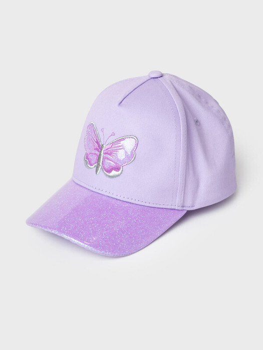 Детская бейсболка для девочки. Классическая форма с изогнутым козырьком. На передней части вышита фиолетовая бабочка. Козырёк выполнен из материала с блестками, что придаёт изделию праздничный вид. Сзади — регулируемая застёжка на липучке. Есть вентиляционные люверсы.