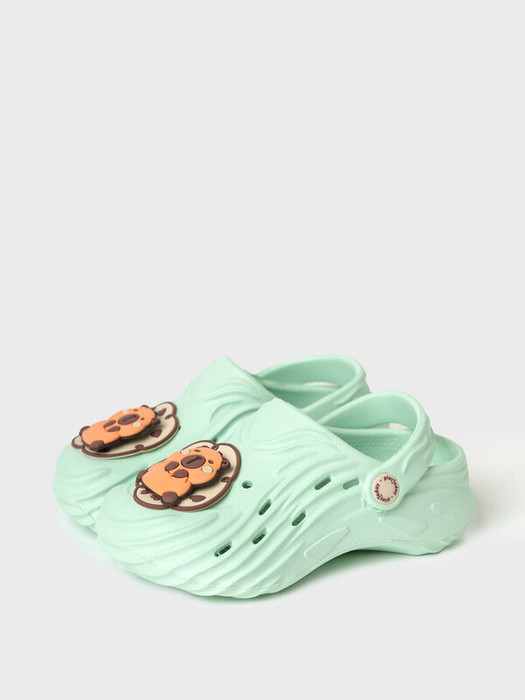 Милые сабо для девочки из облегченного и прочного ЭВА. Материал хорошо моется.  Форма модели учитывает эргономику стопы.  Модель имеет перекидной ремешок фиксации ноги. Модель декорирована крутящимися патчами  со смешным капибара