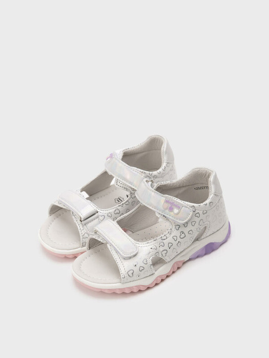 Сандалии детские для девочки. Сандалии с закрытой пяткой выполнены из перламутровой искусственной кожи. Удобные ремни с липучками позволяют регулировать обувь на любой подъем. Подкладка и стелька выполнены из натуральной свиной кожи. Стелька имеет анатомический элемент для поддержания свода стопы в правильном положении. Подошва из ТПР очень гибкая. Подошва с мигающим элементом flashlight.