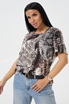 Футболка для дома и отдыха из трикотажного полотна интерлок прямого кроя. Округлая горловина с обтачкой. По горловине, низу рукава и изделия застилы. Короткий рукав со спущенный линией плеча. Спереди и по рукаву принт. По бокам разрезы.
