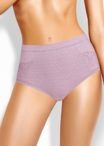 Бикини, комбинированная модель из хлопкового полотна с эластаном и эластичной сетки.На детали переда-фигурный рез, линия которого переходит на спинку.Линии реза и деталь переда декорированы узким кружевом.По талии-ажурная резинка, по ножке-полуокантовка