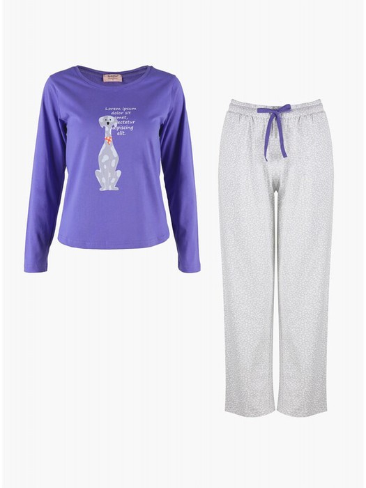 Домашняя пижама (Арт. 3228TCC) от торговой марки Indefini. В комплекте кофта и брюки. Кофта из хлопка, фиолетового цвета, с принтом и надписью, с длинными рукавами, прямая, свободного кроя. Брюки из хлопка, серого цвета, свободного кроя, на мягкой резинке, с регулирующим шнурком.