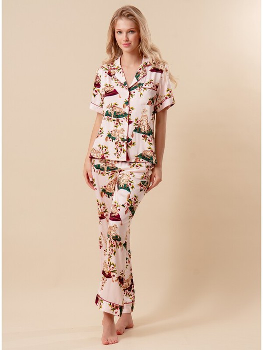 Женская пижама из 100% вискозы – это воплощение комфорта и практичности. Материал приятен к телу, не мнется и обладает дышащими свойствами. В комплекте рубашка с коротким рукавом и брюки на резинке с утягивающим шнуром, что позволяет регулировать посадку под любой тип фигуры. Цветочный принт в сочетании с универсальным кроем подойдет как для домашних образов, так и для образа на выход.
