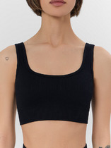 Бюстье женское из кулирной глади. Перед и спинка цельные. Перед на подкладке из кулирной глади. Срезы горловины переда, проймы и верхний срез спинки окантованы бейкой из основного полотна. Окантовка проймы переда переходит в бретель. На продолжении бретели из полотна стоит бретелечная тесьма с регулировкой по длине. Кольца-регуляторы.