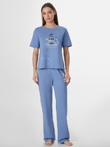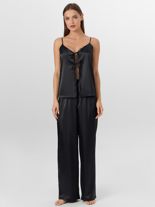 Комплект женский состоит из блузы и брюк. Блуза на тонких бретелях прямая, свободная. Бретели с регулировкой на регуляторы и кольца (пластик 6мм). Верхний срез обработан обтачкой из основного полотна. На передних половинках застрочены вытачки. По переду застежка на завязки.
