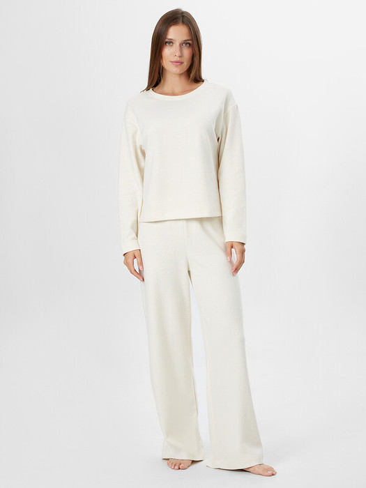 Комплект женский состоит из джемпера (502872) и брюк (532253). Джемпер домашний женский прямого силуэта. Горловина круглой формы, обтачка из основного полотна. Плечо слегка спущено. Рукав втачной, длинный. Нижний срез джемпера обработан швом вподгибку. Брюки с посадкой на талии, свободного силуэта. Пояс цельнокроеный с эластичной тесьмой внутри (внутр. 40мм 40RV). Нижний срез обработан швом в подгибку.