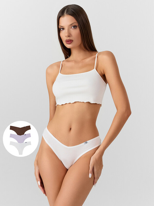 Трусы женские, средняя линия талии, силуэт - бразилиано. Передняя и задняя детали выполнены из рибаны. Верхний срез трусов обработан бейкой поперечной из рибаны, внутри жилка 6мм. Нижние срезы обработаны бейками поперечными из рибаны. Подкладка ластовицы из хлопка, отлетная по верхнему срезу. Посередине бейки по верхнему срезу передней и задней детали застрочена «птичка».