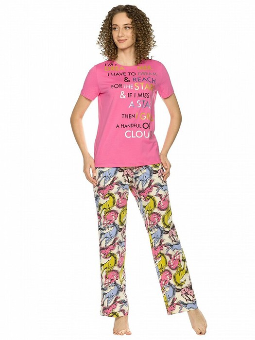 Комплект женски: футболка и брюки. Футболка прямая, небольшого объема. Шрифтовой принт с разноцветным металликом. Перевод Я мечтатель, я должен мечтать и тянуться к звездам. А если я не могу поймать звезду, я ловлю пригоршню облаков . Брюки прямые, свободные, с высокой линией талии. Мягкий стойкий all over принт динамичные и сказочные лошади.