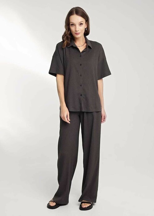 Брюки широкие из трикотажного полотна джерси. По талии притачной пояс на внутренней резинке со шнуром из основного полотна. Боковые карманы с отрезным бочком.