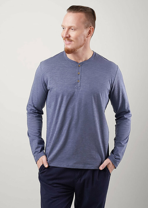 Лонгслив мужской с длинным рукавом, округлой горловиной на планке из фактурного полотна ""флам"". Изделие дополнено имиджевой фурнитурой. Данная модель прекрасно комбинируется с джинсами или шортами благодаря своей универсальности.
