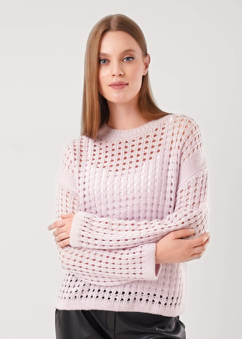 Вязаный джемпер умеренного объема ажурного переплетения из акриловой пряжи с добавлением вискозы. Спущенный длинный рукав, округлая горловина с бейкой. По низу изделия и рукавов узкие манжеты.