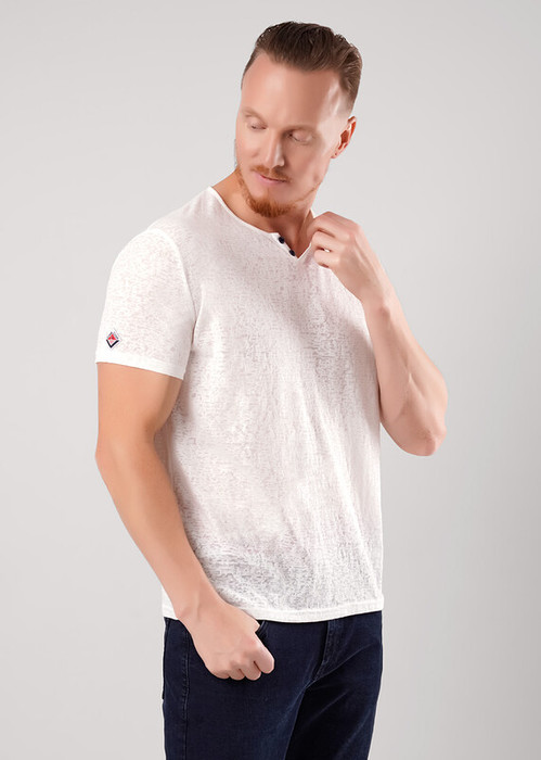 Футболка мужская с круглым вырезом горловины и декоративной планкой с пуговицами, с коротким втачным рукавом. Модель дополнена имиджевой фурнитурой, что делает образ стильным и завершенным.