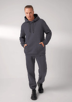 Брюки мужские изготовлены из футера 3-х нитки (без подчёса).Брюки слегка зауженные книзу, посадка средняя. Пояс из рибаны. С внешней стороны пробиты петли и втянут шнур с эглетами (8EKXWCp-1). На деталях переда защипы. По переду карманы с отрезными бочками. Нижние срезы брюк обработаны швом вподгибку.На правой детали спинки накладной карман.