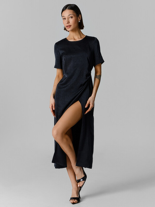 Платье полуприлегающего силуэта, перед и спинка цельнокроенные. Передняя деталь на запах, с завязками. На передней детали заложены складки. Рукава короткие, горловина обработана обтачкой из основного полотна. По спинке вырез-капелька на пуговицу 10мм и жилку тканую (жилка Jw34493, WT4-4). Низ изделия и рукавов в подгибку.