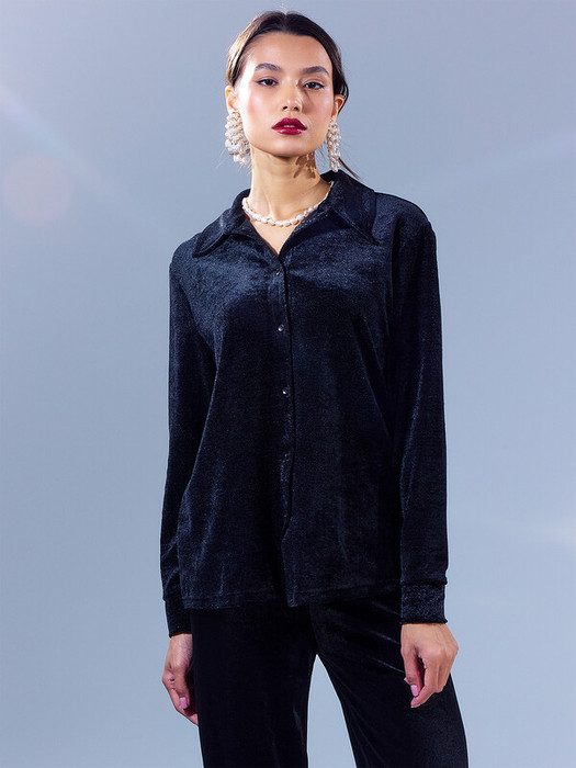 Красивая велюровая рубашка свободного силуэта. Вырез круглый, с отложным воротничком. По центру рубашка застегивается на пуговицы. Спущенная линия плеча и углубленная пройма дарит особый комфорт и свободу. Рукава длинные, на манжетах. Нижняя часть рубашка асимметрична. Красиво!