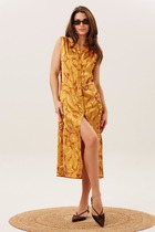 Модель А-силуэта с завышенной талией. Ткань с характерным мягким блеском хорошо драпируется и струится по телу. В жаркое время года приятно охлаждает кожу.