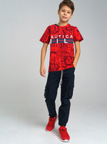 Джемпер для мальчиков свободного силуэта. Рукава втачные короткие. Горловина круглой формы. Горловина и низы рукава окантованы рибаной. Низ футболки обработан швом вподгибку на 2-ух игольной плоскошовной машине.