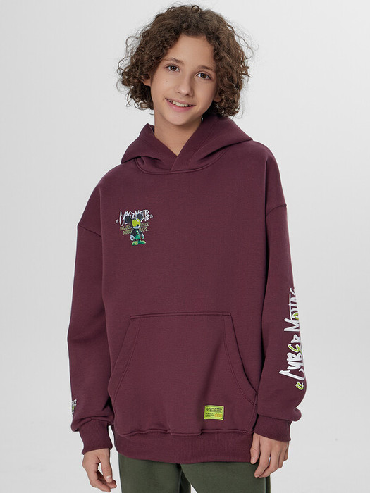Анорак изготовлен из трикотажного полотна футер. Анорак свободного силуэта (оверсайз), с капюшоном. Горловина округлой формы. Капюшон со средним швом, на подкладке из осн. полотна. Плечо спущено, рукав втачной длинный. По низу рукава отрезная манжета из рибаны.