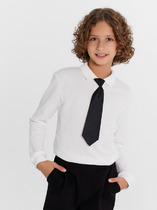 Рубашка для мальчиков прямого силуэта с воротником. По переду обработана застежка на пуговицу d=10mm и петли. На правой детали переда накладной карман. Рукава короткие, втачные, слегка спущены. Нижние срезы изделия и рукавов обработаны швом в подгибку.