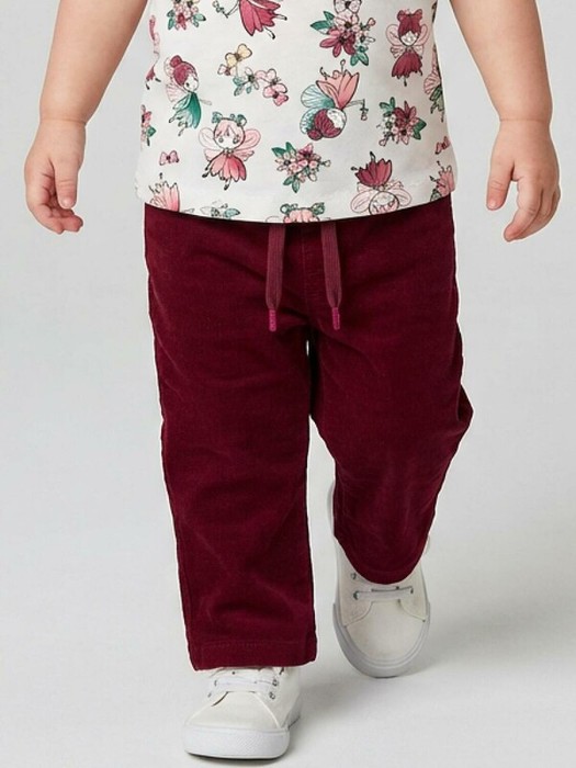 Детские брюки клеш для девочки. Модель из мягкой, хлопковой вельветовой ткани. Брюки с высокой посадкой и легким клешем от колена. Пояс на резинке дополнен шнурком для регулировки. Спереди расположены два боковых кармана, а сзади — два накладных, один из которых украшен симпатичной жаккардовой нашивкой.