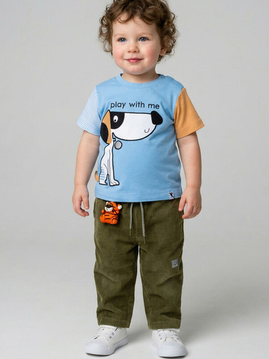 Детские брюки для мальчика. Модель прямого силуэта, выполнена из мягкого хлопкового вельветового трикотажа. У брюк высокий комфортный пояс на широкой резинке и шнурок для регулировки. Спереди — два удобных кармана. Декоративная нашивка, а на левом кармане — съемный брелок в виде тигренка.