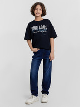 Джинсы багги для девочки подростка. Свободный крой baggy, выполнены из вареного синего денима. Спереди удобные боковые карманы, сзади — накладные. Застежка на молнию и болт. На поясе предусмотрена регулировка за счёт внутренней резинки с пуговицей. Украшены декоративным лейблом на спинке.
