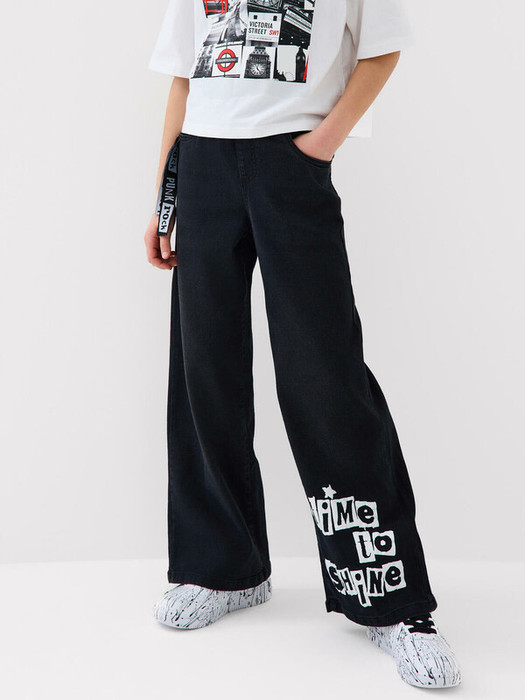 Стильные широкие джинсы для девочки подростка. Пояс на резинке со шнурком делает посадку комфортной и регулируемой. Модель wide leg из черного денима с модным эффектом выварки. У них прямой силуэт и длина до щиколотки. Спереди боковые карманы, а сзади — накладные карманы. На левой штанине — яркий принт, а с боку пояса — декоративные ленты.