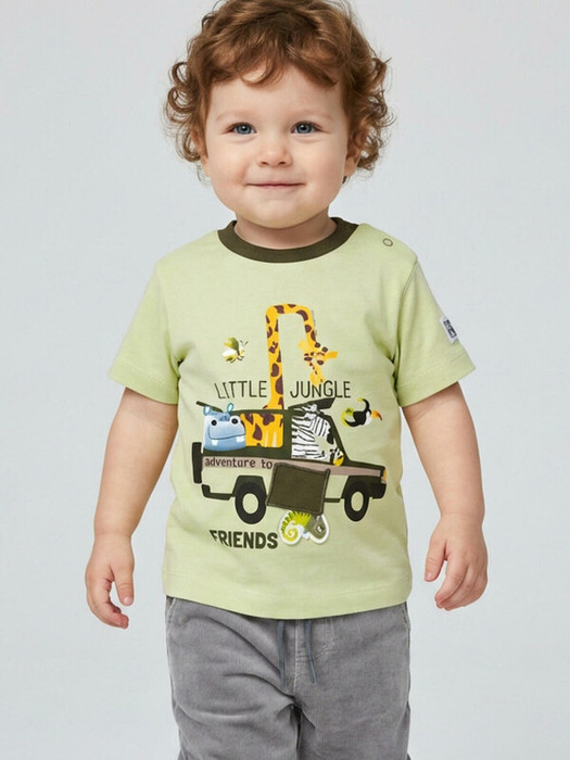 Детская футболка для мальчика. Модель прямого кроя, выполнена из эластичного хлопкового трикотажа джерси. Спереди расположен крупный принт с животными. Горловина круглая, обработана эластичным рибом. На плече застежка на кнопки для удобного переодевания.