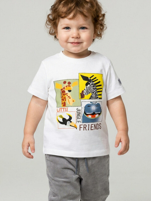 Детская футболка для мальчика. Модель прямого кроя, выполнена из эластичного хлопкового трикотажа джерси. Спереди расположен крупный принт с животными. Горловина круглая, обработана эластичным рибом. На плече застежка на кнопки для удобного переодевания.