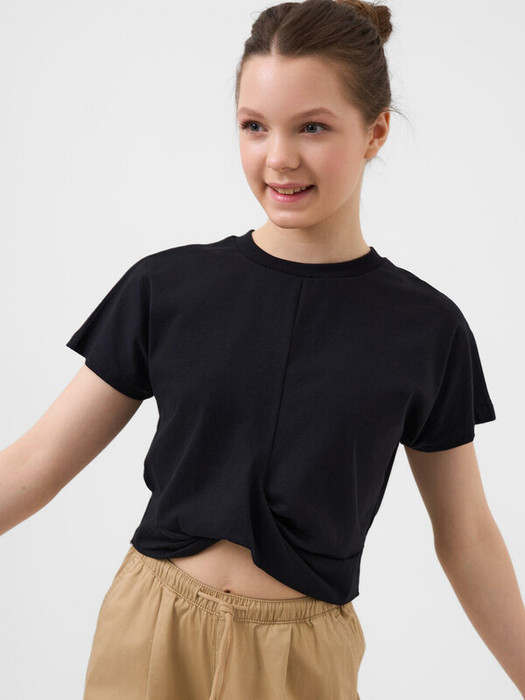 Укороченная черная футболка оверсайз для девочки подростка. Модель с короткими рукавами и круглым вырезом. Основной акцент — драпировка спереди. Изделие выполнено из эластичного хлопкового трикотажа джерси.