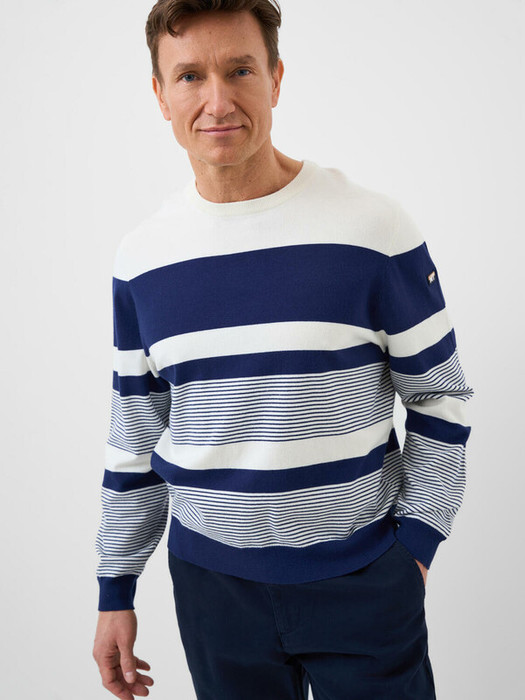 Мужской джемпер. Модель с длинными рукавами и классическим круглым вырезом. Выполнен из вязаного трикотажа и украшен стильным принтом в полоску. Горловина, манжеты и низ изделия обработаны эластичным рибом, что обеспечивает комфортную посадку. На левом рукаве - небольшая фирменная нашивка.