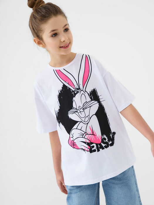 Футболка оверсайз для девочки подростка. Модель выполнена из эластичного хлопкового трикотажа джерси. На груди расположен крупный принт с любимым персонажем "Looney Tunes" Бакз Банни.