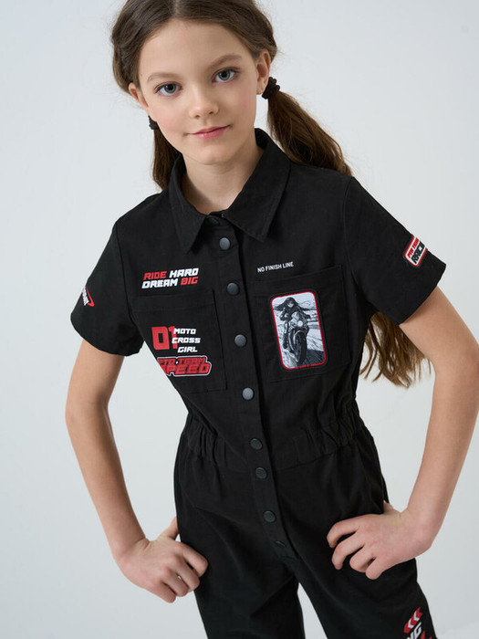 Комбинезон для девочки подростка. Модель маломерит на размер. Застежка на кнопках спереди. По талии и низу брюк встроены внутренние резинки для удобства и лучшей посадки. На груди расположены два накладных кармана, по бокам — карманы. Дизайн изделия вдохновлён гоночной тематикой. Модель с высоким содержанием хлопка.