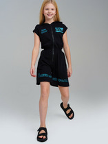 Комбинезон из качественного и приятного на ощупь трикотажа джерси. Высокое содержание хлопка 95%. Благодаря наличию эластана в составе ткани изделие проще в уходе и держит форму. Рукава-крылышки. Застежка на молнию. По талии эластичный пояс со шнурком.