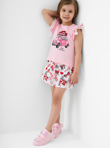 Легкий детский комплект для девочки. Выполнен из мягкого хлопкового трикотажа джерси, состоящий из футболки и юбки-шорт. Футболка прямого кроя с нежным принтом и декором из сетки. На плече застежка на кнопки для удобного переодевания. Рукава-крылышки. Пышная юбка на резинке с воланами, внутри имеет удобные шорты, что делает модель практичной для активного отдыха.