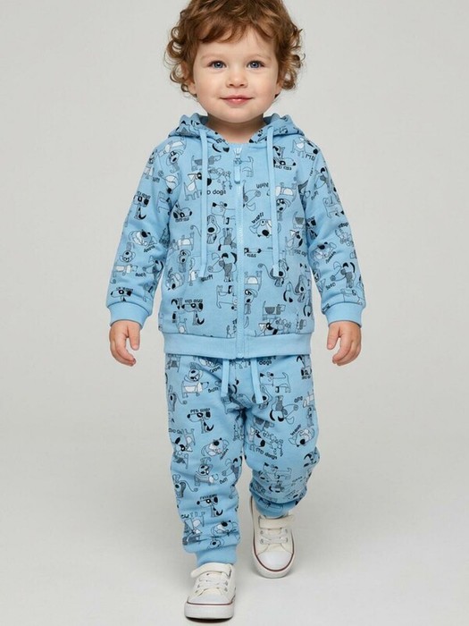 Детский спортивный костюм для мальчика. Комплект выполнен из хлопкового футера и состоит из толстовки на молнии и джогеров на резинке. Толстовка прямого кроя с капюшоном. Капюшон регулируется шнурками. Удобные карманы. Манжеты и пояс выполнены из эластичного трикотажа, благодаря чему изделие хорошо держит форму. Брюки джоггеры — комфортные, с эластичным поясом и шнуром для регулировки посадки. Низ штанин собран на резинку.