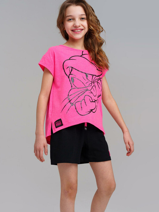 Костюм для девочки подростка. Комплект: футболка и шорты. Высокое содержание хлопка. Шорты на резинке со шнурком.  Модель выполнена из качественного и приятного на ощупь трикотажа.