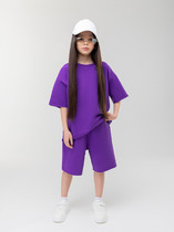 Детский костюм для девочки. Состоит из футболки с коротким рукавом и шорт. Выполнен из хлопкового трикотажа. Укороченная футболка оверсайз с красочным принтом. Шорты свободные, короткие, хорошо сидят на талии благодаря эластичному поясу и регулирующему шнурку. Удобные боковые карманы.