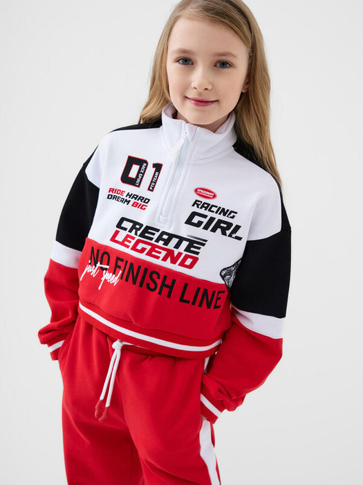 Спортивный костюм для девочки подростка. Комплект выполнен из хлопкового футера и состоит из укороченной толстовки и джогеров на резинке. Толстовка оверсайз с высоким воротником-стойкой. Модель украшена принтами и нашивками в гоночной тематике. Планка с застежкой на молнию. Манжеты и пояс выполнены из эластичного риба, благодаря чему изделие хорошо держит форму. Брюки джоггеры — комфортные, с эластичным поясом и шнуром для регулировки посадки. Удобные боковые карманы. Низ штанин собран на резинку.
