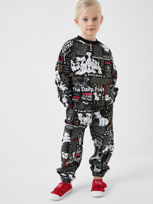 Детский спортивный костюм для девочки. Комплект выполнен из хлопкового футера и состоит из свитшота и джогеров на резинке. Свитшот прямого кроя, украшен красочным принтом с персонажами из "101 далматинца". Манжеты выполнены из эластичного риба. Низ изделия можно затянуть шнурком. Брюки джоггеры — комфортные, с эластичным поясом и шнуром для регулировки посадки. Удобные боковые карманы. Низ штанин собран на резинку.