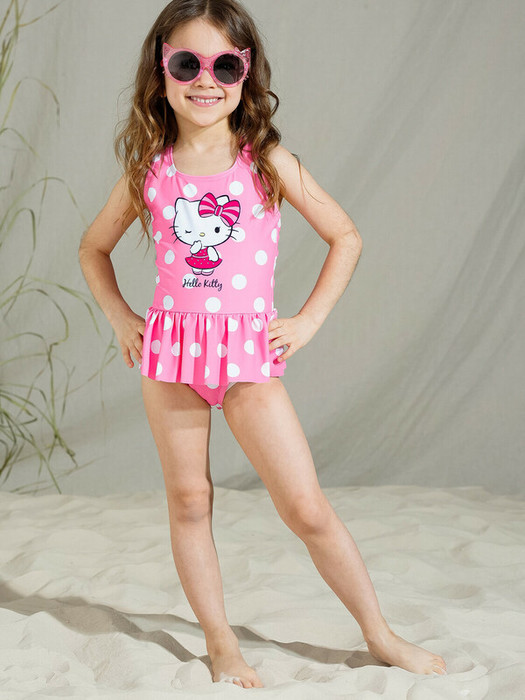 Купальник слитный с юбкой. Принт Hello Kitty. Благодаря UF-защите, ткань сохраняет первоначальный вид даже при длительном пребывании на солнце. Подходит для плавания в бассейне.