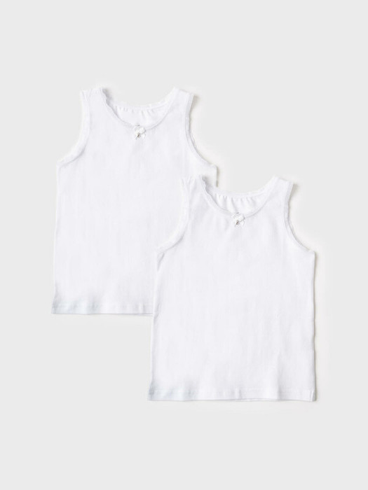 Комплект из двух детских белых маек для девочки. Майки выполнены в классическом прямом крое. У изделий круглая горловина и проймы обработаны окантовкой в тон. Майки изготовлены из мягкого, хлопкового трикотажа, приятного к телу.
