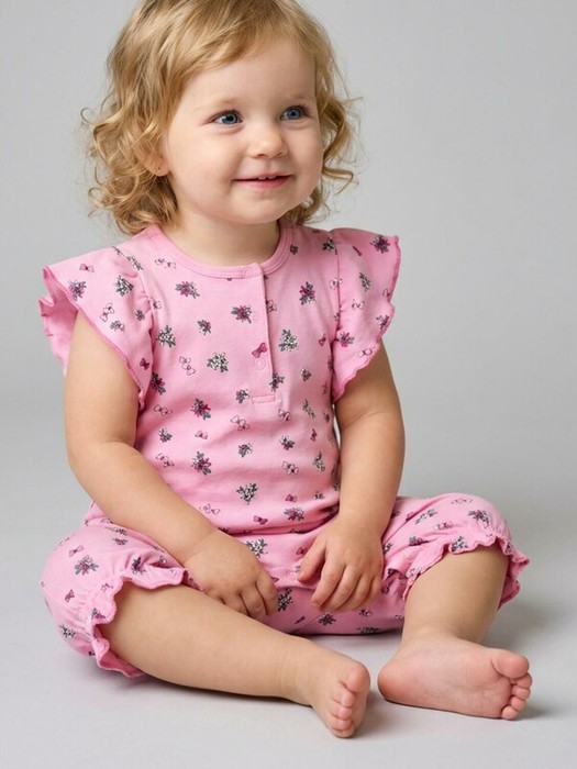 Детский песочник для новорожденной девочки. Выполнен из хлопкового трикотажа интерлок. Рукава-крылышки. Нежный цветочный принт. Планка с застежкой на кнопки. Мягкие резинки аккуратно фиксируют брючины. Застежка на кнопки по низу.