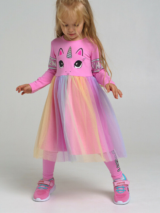 Платье трикотажное с длинным рукавом. Размер изделия на фото - 110, параметры модели (см): рост 104,5, обхват груди-талии-бедер: 53,5-57-53,5. Высокое содержание хлопка 95%. Благодаря наличию эластана в составе ткани изделие держит форму и меньше мнется. Верхняя юбка из сетки с градиентом.
