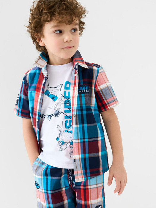 Детская рубашка в клетку для мальчика. Модель прямого кроя, с коротким рукавом. Выполнена из хлопковой ткани поплин. У изделия классический отложной воротник и удобная застежка на кнопки. На груди расположен яркий принт, а на правом рукаве — декоративная нашивка с изображением самолета.
