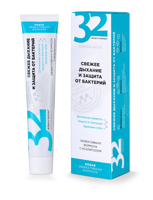 Паста зубная 32 ЖЕМЧУЖИНЫ Свежее дыхание и защита от бактерий эффективно устраняет неприятный запах изо рта и защищает от бактерий. Свежий, ярко выраженный аромат мяты надолго обеспечивает свежее дыхание.