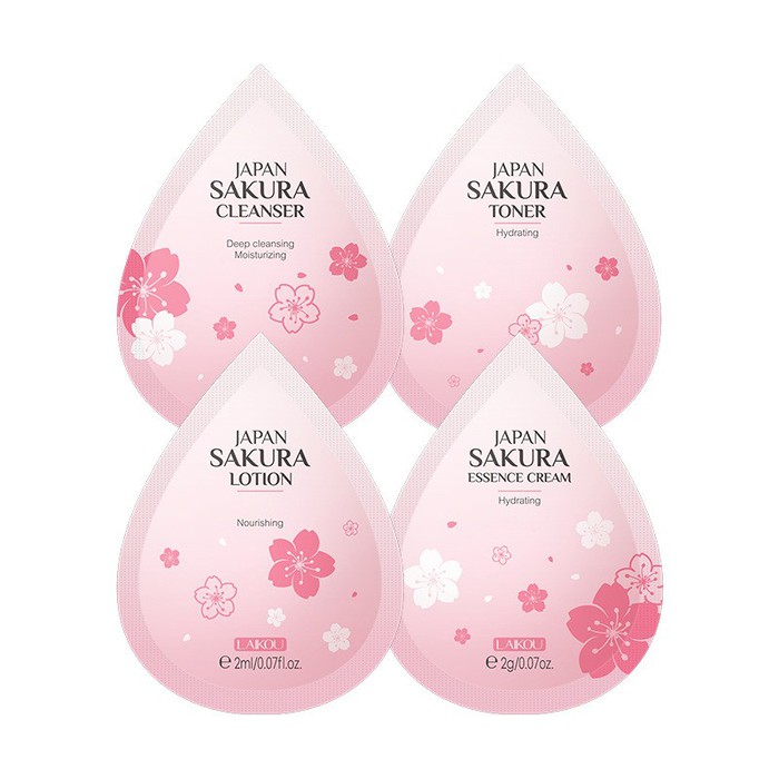 1. Пенка для умывания с экстрактом сакуры, 2 мл.2. Тонер для лица с экстрактом сакуры, 2 мл.3. Лосьон-эмульсия для лица с экстрактом сакуры, 2 мл.4. Крем для лица с экстрактом сакуры, 2 мл.Экстракт сакуры уникальный источник микроэлементов и аминокислот, витамина С и Е, благодаря своему составу, экстракт сакуры делает кожу нежной и сияющей, снимает отечность и успокаивает раздражение, придает коже мягкость и способствует регенерации клеток.