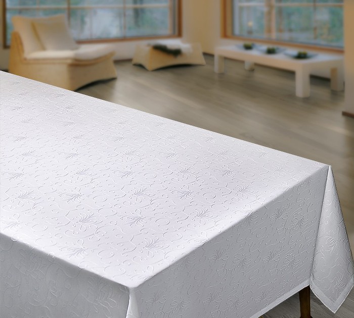 Нарядная и торжетвенная скатерть, ТЕФЛОНОВАЯ ПРОПИТКА. На белоснежном фоне "под сатин" вышит мерцающей нитью рельефный рисунок на цветочные мотивы. Обработка края - подгибка и прошивка, укрепление флизелином. Обладает высокими потребительскими качествами. 100 % полиэстер. Производство - фабрика WISAN (Польша).